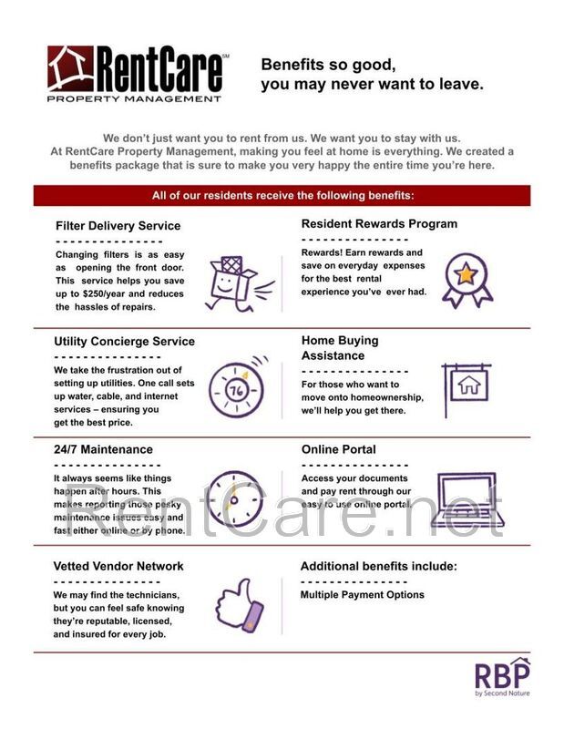 RentCare Property Management residents are enrolled in the Resident Benefits Package. There is an additional $35.00 a month charge for this added to the advertised rent and is considered additional rent.