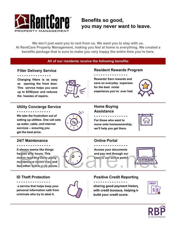 RentCare Property Management residents are enrolled in the Resident Benefits Package. There is an additional $35.00 a month charge for this added to the advertised rent and is considered additional rent.